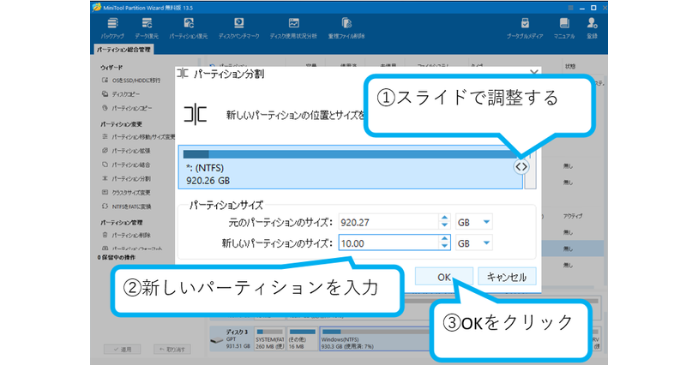 パーティションを分割します。スライドで新しいパーティションを調整するか、値を入力して新しいパーティションを作成するを選びます。そして「OK」をクリック。